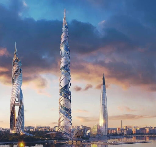 С недавних пор в Санкт-Петербурге заговорили о второй башне на берегу Финского залива. Предполагается, что новый небоскреб будет выше существующего почти в два раза, то есть достигнет высоты в 703 метра. И на этот раз амбиции Газпрома будет воплощать уже хорошо нам известный шотландский архитектор Тони Кеттл. «Башня — это олицетворение идеи энергии, постоянно меняющаяся, скручивающаяся форма вдохновлена энергией потоков воды, формой кристаллов льда, которые меняют ландшафт города в разные времена года.» «Меня больше интересуют основные свойства геометрии в природе, кодирование через ДНК, программирующее органические формы, чем природные материалы», — сказал Тони Кеттл, рассуждая о поклонении современных архитекторов Природе. Видимо в «спирали ДНК» архитектор и увидел образ, вдохновивший его на второй небоскреб. Не все знают, что в основании уже существующей башни – «сложная геометрическая конструкция из круга и пяти квадратов, которые при повороте вокруг своей оси превращаются в краси
