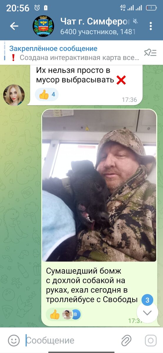 Он решил помочь. 👍 Не сбивать меня с программы забега в клинику и отстерилить Плюшку сам. В трёх кварталах от нас есть небольшая клиника. Туда и потопал. Не учёл всего пары моментов. Проливного дождя и полусонной послеоперационной собаки. 😅 После операции подхватил на руки Плюшку и пошёл. 🤯 Быстро понял, что перегнул. И дотащить не сможет. Собачка то немаленькая. Потопал на троллейбус. В итоге имеем вот такое фото в Симферопольском чате 😂😂😂🤣🤣🤣 С Плюшкой всё отлично. С Димой тоже. А у меня теперь есть фото на заставку в телефон. Только посмотрю и смех до слез 🤣🤣🤣 *** *** *** ❤Помочь: СБП +7 (978) 207-84-67 Карта Сбер 5336 6901 6485 2974 Карта РНКБ 2200 0202 2846 2729 Толкачёва Елена Борисовна Все карты привязаны к тел +7 (978) 207-84-67 ЮMoney (Яндекс) 410016367487382 Qiwi +79782078467