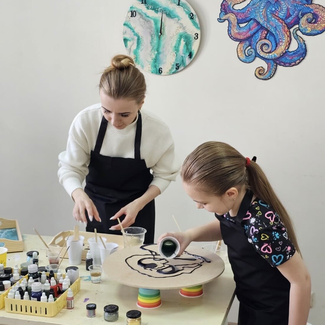 Флюид арт - необычная техника рисования (жидкие краски выливаются на холст, смешиваются тонкой палочкой или посредством выдувания, образуя уникальные узоры. Владения определёнными навыками не потребуется - сможет абсолютно любой.