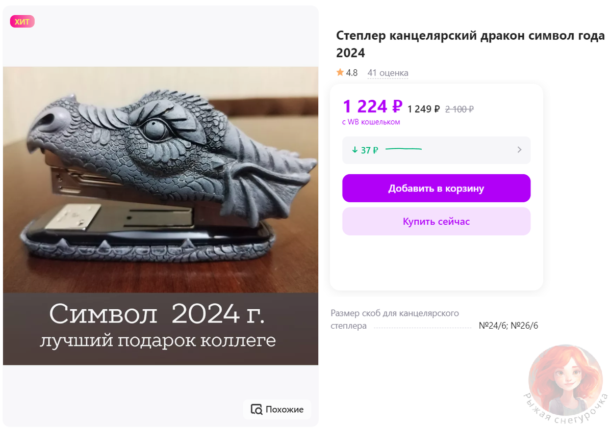 Всем привет! На связи Рыжая снегурочка. Так хочется найти что-то необычное и в то же время милое. Поэтому собрала интересную подборку специально для вас. Приятного просмотра! 1. Степлер Артикул - 170259073 Рейтинг - 4.8 Ни у кого из знакомых и даже на работе не видела такой интересный степлер. Выглядит необычно и целый год будет символом 2024 года, а потом будет просто драконьей головой). А еще степлер можно подарить начальнику или коллеге, вот будет у человека удивление) Отзыв Массивный, необычный степлер! Качественно сделан и упакован! 👍 Стильный подарок! 2. Брошь Артикул - 38848042 Рейтинг - 4.9 Ошеломленная чем-то сова. Такое выражение лица у брошки может полностью передавать ваше внутреннее состояние души. Смотрится необычно и прикольно. Упакована в красивую коробочку. Отзыв Брошь классная. Веселенькая. позитивная. Упакована в коробочку, спасибо за подарочек!!! 3. Чашка с блюдцем Артикул - 197648715 Рейтинг - 5 Ну что за уникальнейшая вещь) Кружка на подушке смотрится необычно