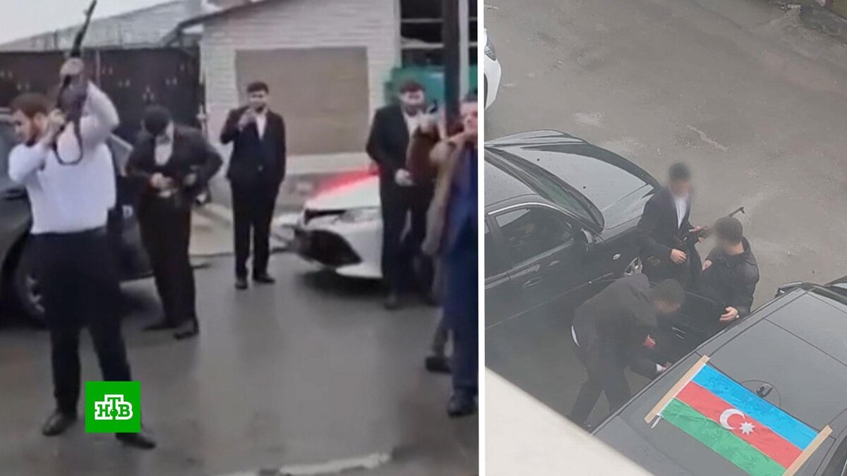[ Смотреть видео на сайте НТВ ] В Черкесске задержали вооруженных гостей свадьбы. Кортеж полицейские остановили прямо на выезде из города. Повод для этого был очень громким — мужчины стреляли из автоматов у местного ресторана. Сотрясали воздух они и при задержании, правоохранителям не сразу удалось доставить их в отдел. Личности всех нарушителей — это представители азербайджанской диаспоры — уже установлены. Вряд ли жителей северо-кавказских республик можно удивить стрельбой на свадьбе — это едва ли не самый любимый местный обычай. Но стреляют празднующие, как правило, где-то в безлюдных местах и из охолощенного безопасного оружия. В этот раз события же происходили прямо в Черкесске, рядом с одним из местных ресторанов. Одним из организаторов такого представления был, как говорят силовики, Кемал Ахмедов. Он является крупным бизнесменом в строительной сфере, а также сыном руководителя местной азербайджанской диаспоры — Ильхама Ахмедова. Полицейские нашли на месте стрельбы большое количе