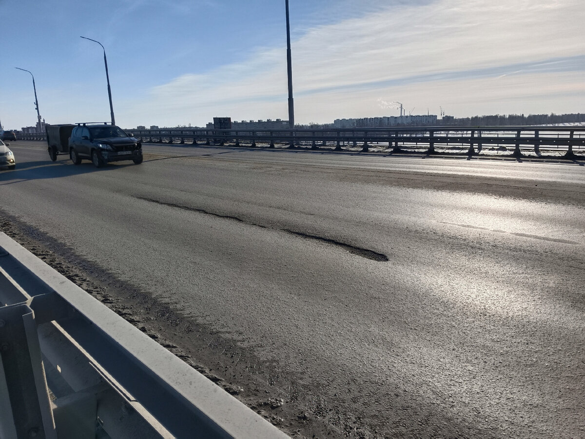 Проблема колейности на мосту Победы известна автомобилистам уже не один год, однако теперь ее усугубило фактическое разрушение верхнего слоя асфальта. Деформация будет только увеличиваться изо дня в день: большегрузы попросту выбьют асфальт, увеличивая площадь и глубину ям.