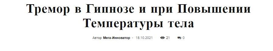 Моя статья "Тремор в гипнозе и при повышении температуры тела" была опубликована на сайте Мегаинноватор 18 октября 2021-го года (ещё раньше опубликовала её в соц сети в ВК). Позже сайт был закрыт и статья пропала, копия у меня не сохранилась. Но, благодаря умной Всемирной паутине, копия статьи с датой публикации сохранилась в архивах Интернета. Вчера я её нашла в связи с тем, что гипнотизёры России начали реализовать эту Идею, не говоря и о моём участии в данном вопросе. Причём участии весьма важном. Хочу таким образом восстановить своё авторство. И данной публикацией закрепить авторские права на свою работу, идею.
