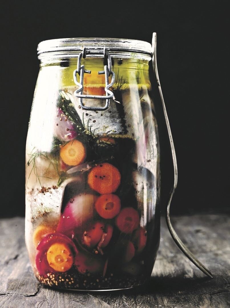 200 г. красных луковиц 200 г. моркови 100 мл. рапсового масла холодного отжима 100 мл. яблочного уксуса 90 г. коричневого сахара 100 мл. воды 4 лавровых листа 1 ст. л. горошин черного перца 1 ст. л. ягод можжевельника 1 ст. л. зерен кориандра 2 ст. л. готовой горчицы 10 филе соленой сельди 50 г. укропа Очистите лук и морковь, лук нарежьте дольками, а морковь - кружочками. Положите овощи в кастрюлю вместе с оставшимися ингредиентами, кроме сельди и укропа. Держите на огне до тех пор, пока отвар не загустеет. Полностью остудите. Сложите филе сельди в большую стерилизованную банку, залейте холодным густым отваром с овощами и добавьте укроп. Плотно закройте крышку, поместите в холодильник и оставьте минимум на 3 дня, после чего сельдь можно есть. Подавайте сельдь на ржаном хлебе, положив сверху кольца сырого лука и немного свежего укропа. Маринованную сельдь в закрытой банке можно хранить в холодильнике 2-3 месяца, а после того как вы откроете банку, рыбу следует съесть в