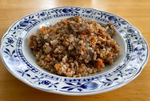 4. В кастрюлю к готовой гречке добавить мясо с луком и морковью (если в сотейнике с мясом слишком много жидкости, вынуть мясо и овощи шумовкой). Перемешать. Оставшийся от тушения мяса соус подать отдельно как подливу.