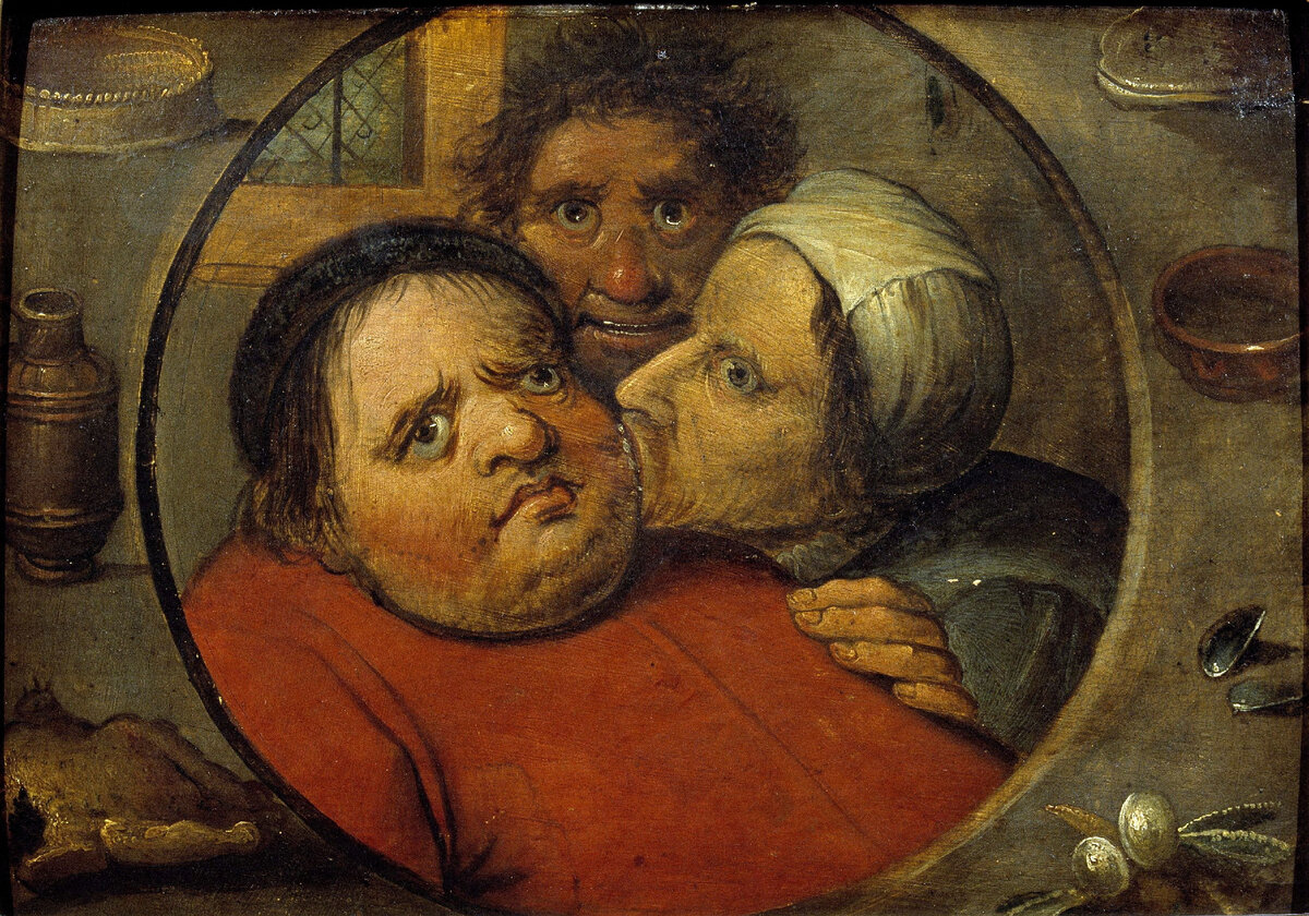 Перед вами - три почти одинаковые картины с весьма странным сюжетом. Первая, которую вы видите выше, приписывается Питеру Брейгелю Старшему (1525-1569 гг). И пожалуй, наиболее известна. На самом деле - никто точно не знает Брейгель это или не Брейгель. И вообще - это копия с утраченного оригинала. Но по времени создания и грубоватой манере письма принято считать, что это именно Брейгель. Произведение называется весьма любопытно: Борьба Масленицы с Постом. Это адаптированный русский вариант. Если дословно - Борьба между Карнавалом и Великим Постом. Борьба, прямо скажем, странная. Карнавал изображен в виде упитанного монаха, которому происходящее не нравится, но как раз бороться он и не пытается. Просто морщится. Зато персонаж рядом, олицетворяющий Пост с его, видимо, голодом (хотя какой там голод во время Поста? Просто другое меню) очень странно потянул губки к сочной розовой щеке монаха. Губы трубочкой, зубы, неожиданно, растут прямо из губ, и по кругу, и неясны намерения этого контакт