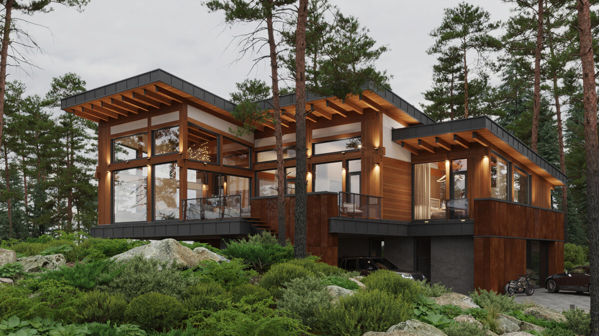 В сердце элитного коттеджного поселка Ленинградской области скоро будет возвышаться уникальное архитектурное творение — дом "Тироль". На данный момент объект находится в стадии сборки домокомплекта. Этот двухъярусный оазис современного стиля и высоких технологий создан с учетом сложных геопластических особенностей участка и окружающего хвойного леса. Первый ярус Функциональная элегантность. Первый ярус дома из бетона и выполняет роль не только функциональной основы, но и гармонично вписывается в рельеф окружающей местности. Здесь находятся гараж, просторная прихожая, гардероб, прачечная и котельная, каждое помещение оформлено с вниманием к деталям. Верхний Ярус Слияние с природой. Фахверковый верхний ярус с панорамным остеклением словно танцует с природой. Из окон открывается волшебный вид на валуны, устланные мхом, и кроны сосен. Тут архитектура дома становится по-настоящему магической, сочетая современность с окружающей природой. Тектоника фасадов Игра света и тени. Искусство тект