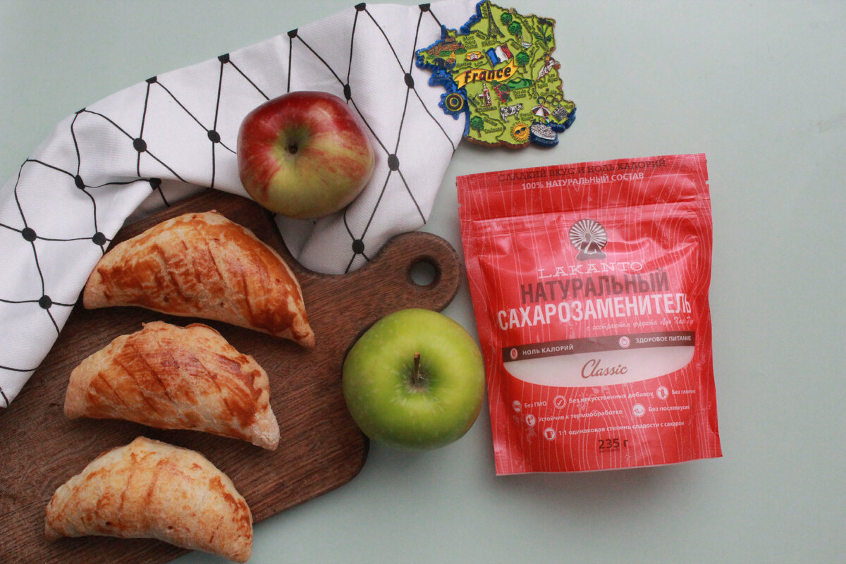 Традиционный шоссон это воздушная, хрустящая сверху и нежная тающая внутри выпечка, которая пришла к нам из Франции. Шоссон очень популярен у себя на родине и за ее пределами. Особый вкус начинке этого блюда французской кухни придает сочетание двух сортов яблок в разных текстурах - яблочный крем и карамелизованные яблоки. Если у вас есть яблоки других сортов или только один сорт, то смело готовьте из имеющихся ингредиентов и наслаждайтесь потрясающим вкусом десерта. Мы заменили традиционный сахар на натуральный сахарозаменитель Lakanto, который позволил снизить калорийность французского десерта и сохранить при этом нежный сладкий вкус блюда. Шоссон станет отличным вариантом как для завтрака, так и для полдника. Ингредиенты Карамельные яблоки: Яблочный крем: Приготовление: Приятного аппетита.