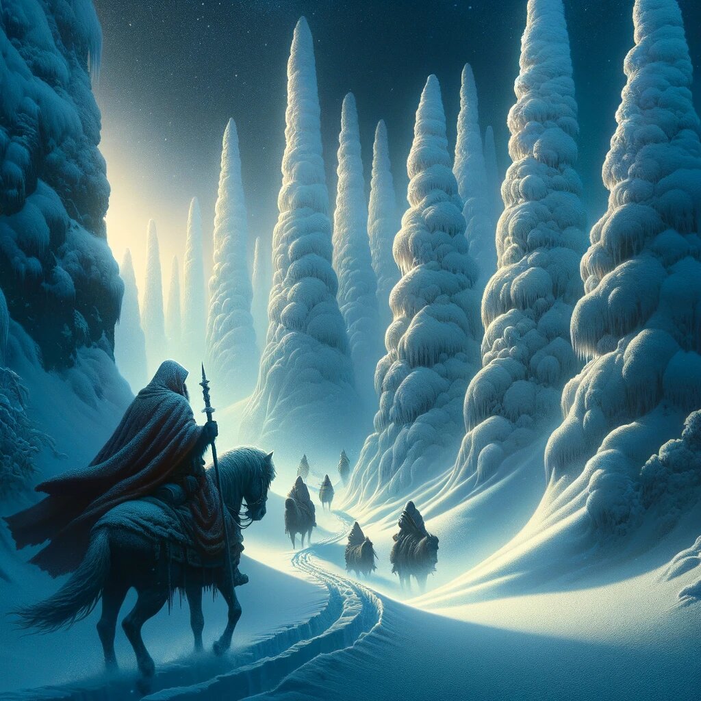 Вздымающиеся сугробы, словно стражи зимнего царства, окаймляли узкую тропу, по которой медленно двигалась группа всадников. Их шаги вгрызались в пушистый снежный покров, оставляя за собой четкие, глубокие следы, словно подпись их путешествия в этом морозном мире. Холодный ветер, носитель зимних тайн, непреклонно проникал сквозь ткани их одежд, заставляя всадников прижимать плащи к телам еще крепче, словно они искали утешение в этом скромном жесте согревания.