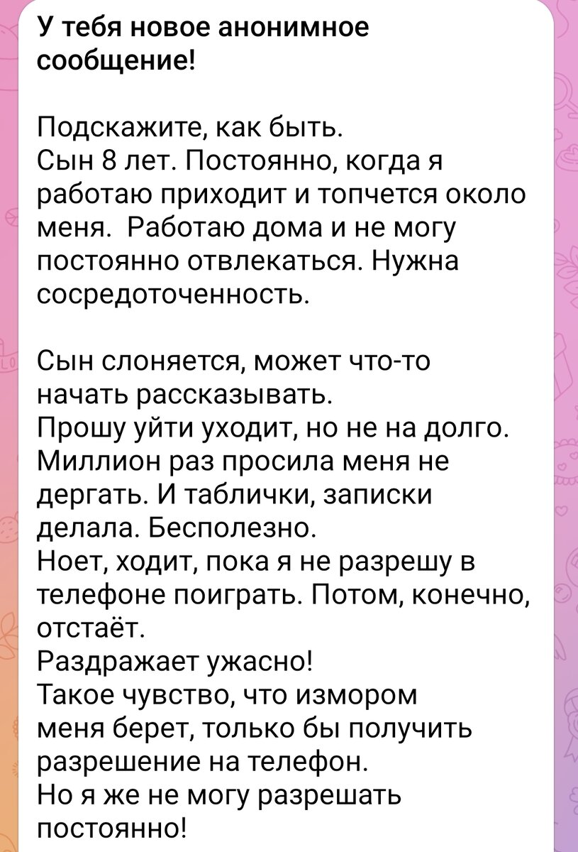Здравствуйте! Вы знаете, довольно часто, работающие дома мамы жалуются на подобные ситуации. Даже, если мама в декрете, но присела на минутку отдохнуть или потупить в телефоне, то сразу же детям нужно о себе напомнить. Давайте рассмотрим проблему с двух сторон. Во-первых, да, раз подобным образом я получаю телефон, почему бы и не поотвлекать маму. Механизм работает, ребенок им пользуется. Но, думаю, вам сие не очень по нраву. Фактически приходится подкупать свое право на работу или личное пространство. С воспитательной точки зрения – так себе научение. Во-вторых, ребенок может не осознавать и не озвучивать, что ему от мамы нужно что-то на несколько ином уровне. Давая развлекушку, мы можем запускать привычку к избегающему поведению. Как это работает? Возможно, ребенок пришел не ради телефона. А что-то беспокоит, в школе неурядицы, чувствует неуверенность. Да мало ли… А вместо разговора, поддержки получает суррогат. Однако, проблема так и не была решена. Добавим сюда то, ч