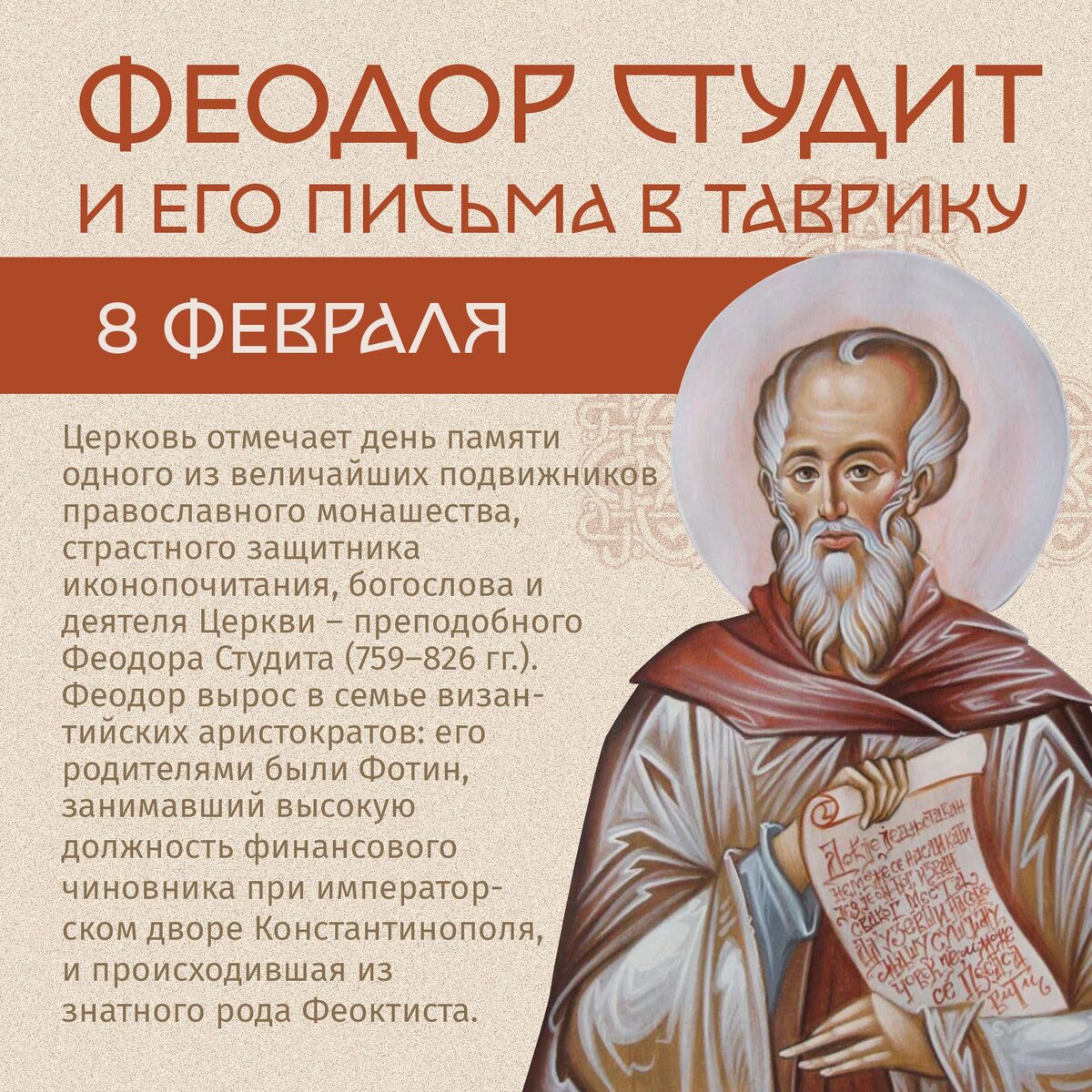 8 февраля Церковь отмечает день памяти одного из величайших подвижников православного монашества, страстного защитника иконопочитания, богослова и деятеля Церкви – преподобного Феодора Студита (759–826 гг.). Подробнее о празднике рассказали в карточках: