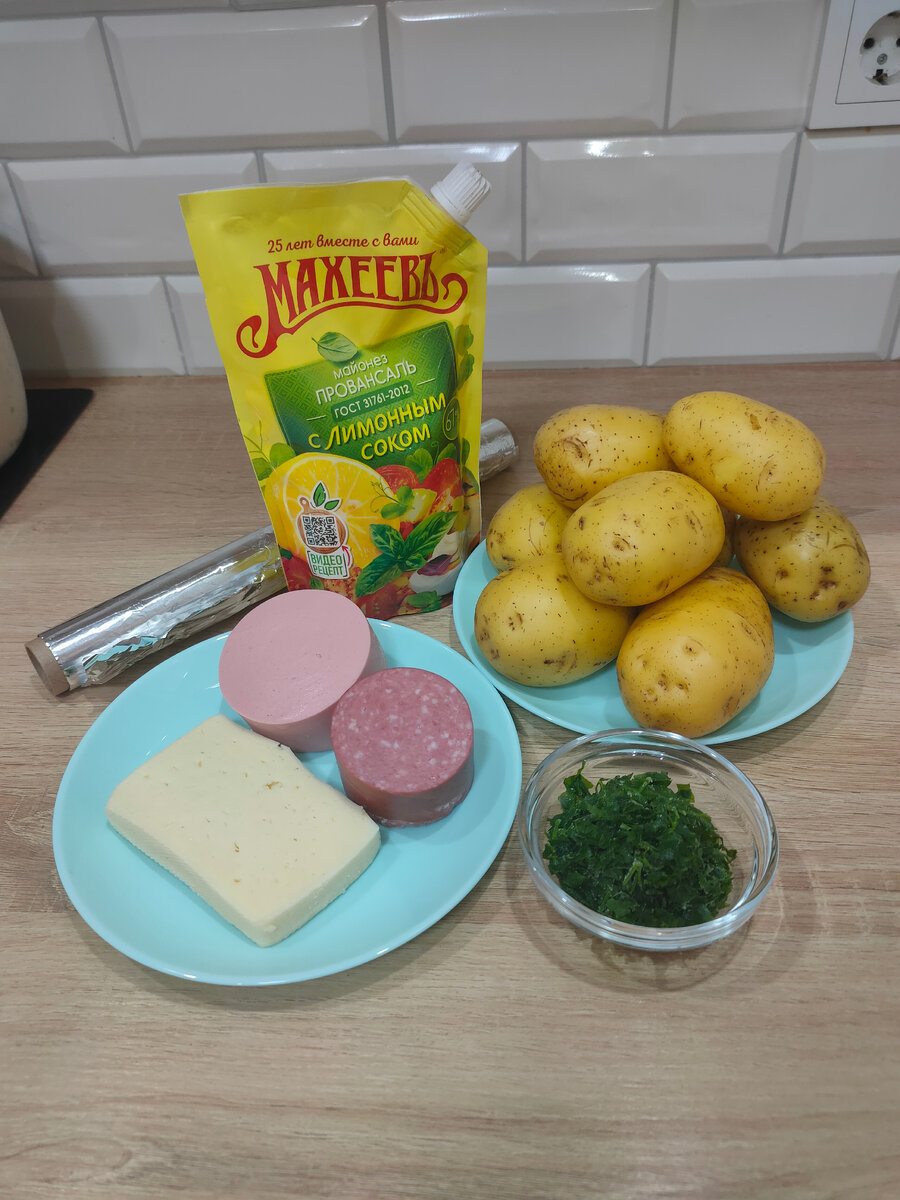 Дело к вечеру и я как всегда ломаю голову.... Что бы такое приготовить. Вспомнила, что давно хотела попробовать приготовить что-то аля "крошка-картошка". Ну чтож, попробуем. Нам понадобится: Приступим. Первым делом нужно очень хорошо отмыть картофель. Я замачиваю в воде, затем мою губкой или щеткой с моющим средством для посуды. Затем картофель натираю солью, прокалываю в нескольких местах и заворачиваю в фольгу. Отправляю запекаться при температуре 200°с около часа. Тут всё зависит от сорта и размера картофеля. Пока картофель запекается, готовлю начинку. Тут всё просто, нарезаю колбасу кубиком, добавляю немного соли, черный перец, зелень и майонез. Всё перемешала. Сыр натерла на крупной терке. Как только картофель запекся, достаю из духовки и аккуратно раскрываю фольгу. Тут осторожно, лучше, конечно подождать, но мне хочется побыстрее) Разрезаю картофель пополам и немного разминаю вилкой. Выкладываю начинку и посыпаю сверху сыром. На фото пока что без сыра, ну тут и так всё