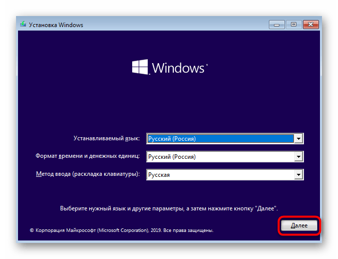 Вставьте полученную загрузочный диск в дисковод либо флешку в свободный USB-разъем и запустите компьютер. При появлении формы выбора языка осуществите это действие, а затем нажмите на кнопку «Далее».