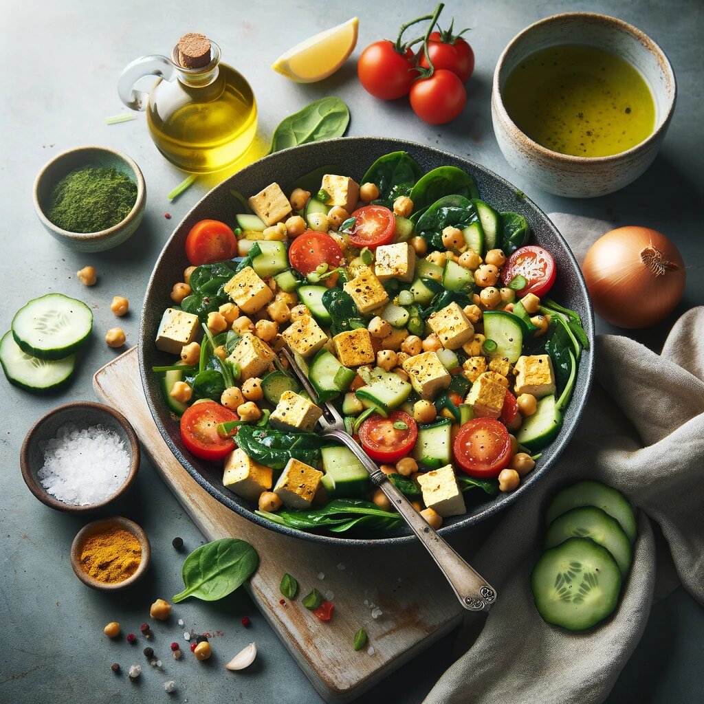 Завтрак: Жареный тофу с шпинатом и помидорами Ингредиенты: Инструкции: Обед: Салат из нута с огурцом и лимонным соусом Ингредиенты: Инструкции: Ужин: Гриль-куриное филе с жареными овощами Ингредиенты: Инструкции: Приятного аппетита!