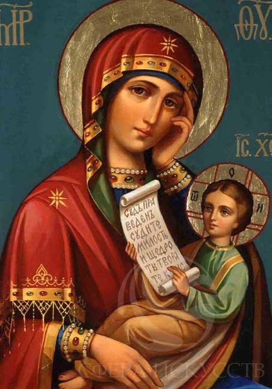 Ра́дуйся, в ве́ре благочести́выя сохраня́ющая; ра́дуйся, не почита́ющих ико́ны Твоя́ святы́я, я́ко прах, от лица́ земли́ развева́ющая.