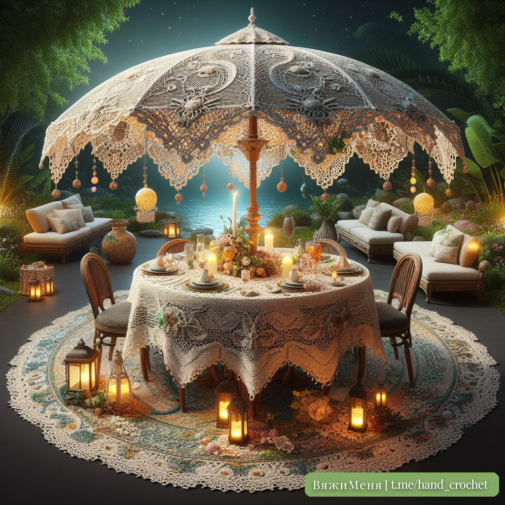 Летний Пикник: Вязаный Зонтик и Столик в саду.