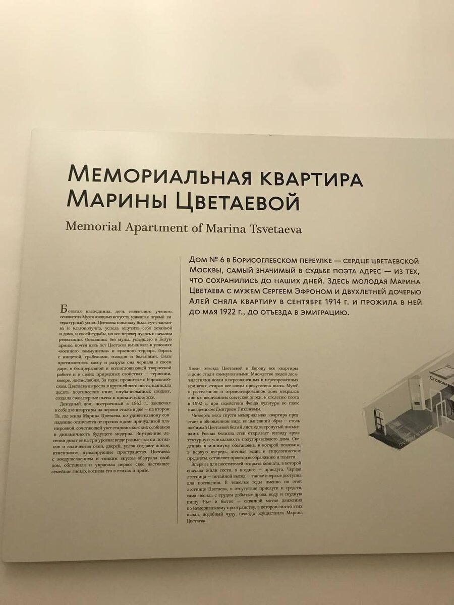 В 1914-м полутораэтажную квартиру № 3 сняли молодые супруги Марина Цветаева и Сергей Эфрон с маленькой дочкой Ариадной. Все начиналось как в сказке. Рядом живописный Арбат, места, которые хорошо знала и поэт (Цветаева настаивала на мужском варианте слова), и ее супруг, тогда еще студент. Необыкновенная планировка квартиры на втором этаже дома — в три уровня, с мезонином и мансардой — напоминала и Марине, и Сергею дома их детства. В квартире было восемь комнат, различающихся размерами и высотой потолков, и просторная кухня. Из комнаты мужа в мезонине можно было выйти на крышу-террасу. В то благополучное время Цветаева называла новое жилище волшебным домом, колодцем уюта и волшебства.