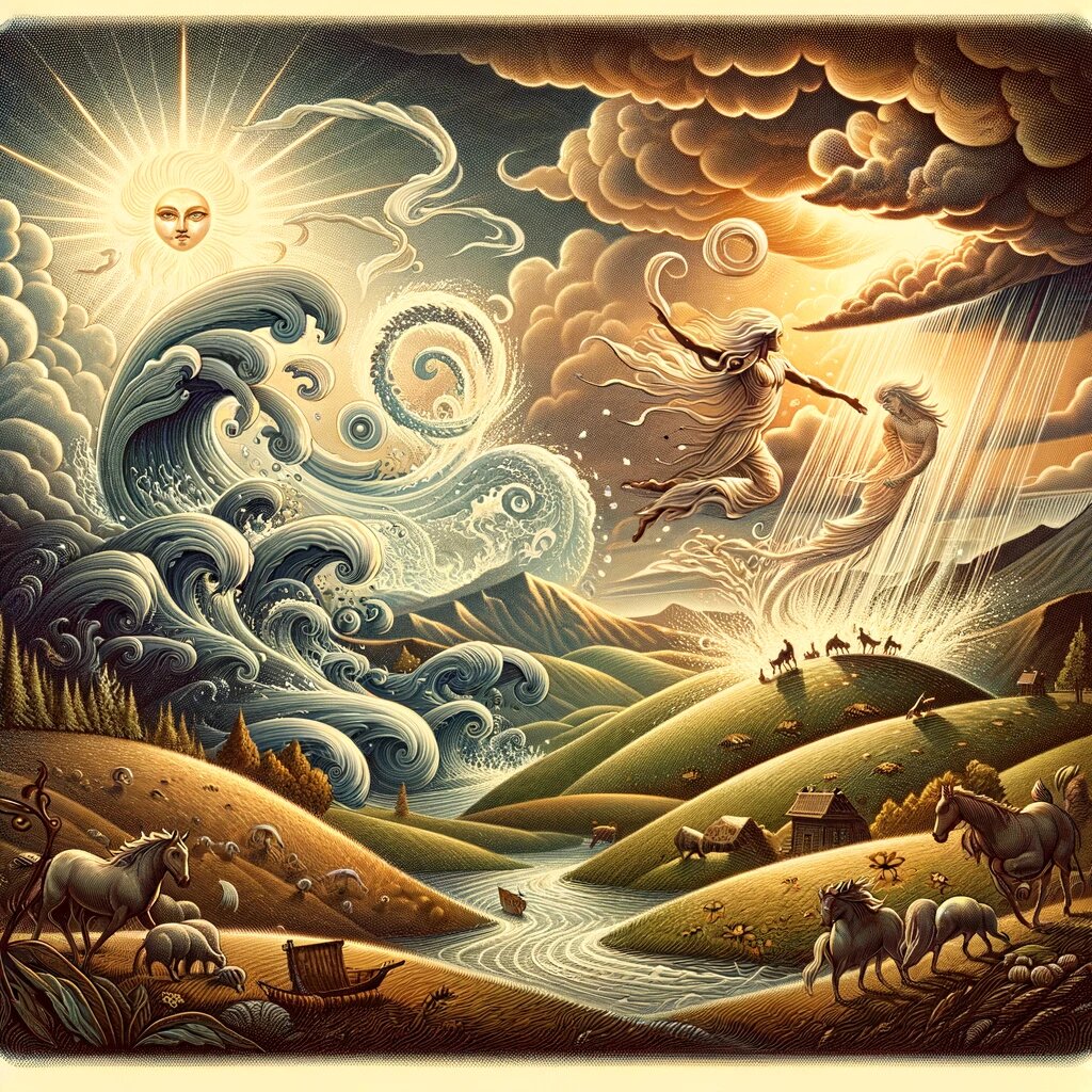 В сердце Удмуртии, где земля возвышается и опускается, создавая живописные горы и долины, живет древняя легенда. Эта история, передаваемая из поколения в поколение, раскрывает тайну могущественных сил природы, которые формировали эти уникальные ландшафты. Сегодня я хочу поделиться с вами этой легендой и её значением для удмуртской культуры и нашего понимания природы. Противостояние Ветра и Дождя В древние времена, когда природа была полна тайн и загадок, Ветер и Дождь жили в гармонии, делили мир между собой. Но однажды между ними вспыхнул спор, который разорвал этот мирный союз. Они решили доказать свою мощь и силу друг перед другом, начав соревнование, результаты которого мы можем наблюдать и сегодня в величественных горах и плодородных долинах Удмуртии. Дождь заявил, что он способен изрезать землю настолько мощными и неудержимыми потоками, что не останется ни одного ровного места. Он начал лить как из ведра, каждая капля ударяла по земле с невиданной силой, стремясь исполнить своё об