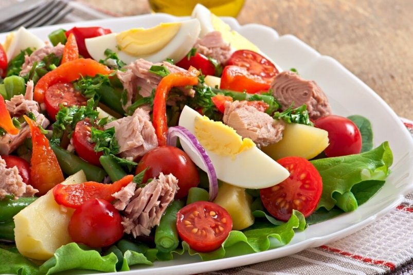 Блюдо точно понравится тем, кто находится в поиске новых небанальных вкусов Салат с тунцом, картофелем и овощами — это идеальный вариант для тех, кто ищет баланс между легкостью и сытностью. Этот салат является не только источником ценных белков и витаминов, но и настоящим удовольствием для гурманов. Ингредиенты: Для заправки: Способ приготовления: Картофель вымойте и сварите в подсоленной воде до готовности. Выньте, после остывания очистите и нарежьте на небольшие дольки. Яйца сварите вкрутую, остудите, разрежьте на четыре части. Стручковую фасоль отварите до готовности, остудите. В большой миске смешайте картофель, тунец, нарезанный на брусочки красный перец, нарезанный полукольцами репчатый лук и стручковую фасоль. Добавьте томаты черри, разрезанные на части. В отдельной емкости приготовьте заправку: смешайте оливковое масло, лимонный сок, горчицу и мед. Взбейте до однородности. Полейте салат заправкой и аккуратно перемешайте, чтобы все ингредиенты хорошо пропитались. Посолите и поп