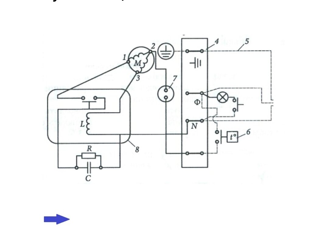 В условиях круглосуточного пользования холодильником и цикличной работы холодильного агрегата включать пусковую обмотку при запусках двигателя вручную не представляется возможным. Для этой цели в агрегатах бытовых холодильников установлено пусковое реле. Типы режимов пуска электродвигателей м/компрессоров бытовых холодильников: Тип 1 – RSCR - запуск через пускозащитное реле 8 и резистор R, работа через конденсатор С и рабочую обмотку. 1,2,3, - выводы обмоток электродвигателя, 4 – клеммная колодка, 5 – провод включения в сеть, 6 – терморегулятор, 7-реле тепловой защиты, 8 – реле