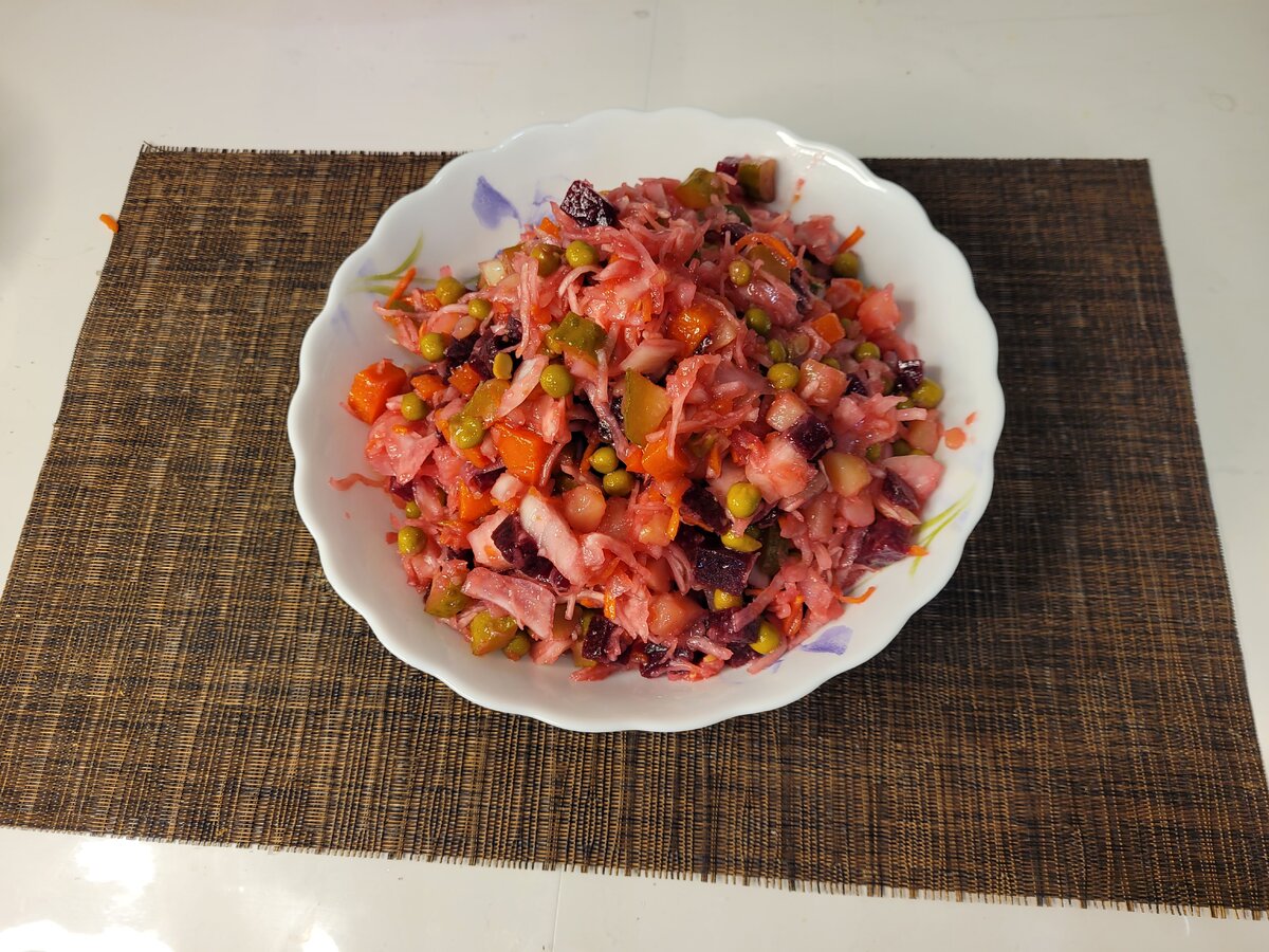Классический винегрет - это довольно сытный и витаминный салат, который многим известен с детства. Но в последнее время винегрет все реже и реже встречается на столах. Напомню рецептик классического винегрета. Продукты Капуста квашеная - 350 г Картофель - 3 шт. (средний размер) Свекла - 2 шт. (средний размер) Морковь - 2 шт. (средний размер) Горошек зеленый консервированный - 300 г Лук репчатый - 1 шт. Огурцы соленые -3 шт. Масло подсолнечное (нерафинированное) - 2 ст. ложки Картофель, свеклу и морковь варим до готовности, очищаем и нарезаем кубиками размером примерно 1 на 1 см. Кубиками такого же размера нарезаем огурцы и лук. Все выкладываем в емкость для удобного перемешивания. Добавляем в емкость с овощами квашеную капусту и горошек. Аккуратненько всё перемешиваем, чтобы салат не превратился в пюре. Добавляем подсолнечное масо и снова аккуратно перемешиваем. Солить не нужно, соленые огурцы отдадут часть соли другим овощам. Ставим винегрет в холодильник на 15-20 минут, перемешива