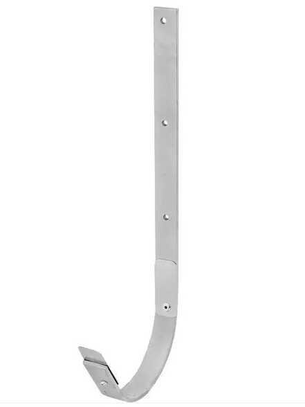 Изогнутый держатель желоба прикручивают одним саморезом к доске обрешётки. При этом свес кровли должен находиться над центром крючка.