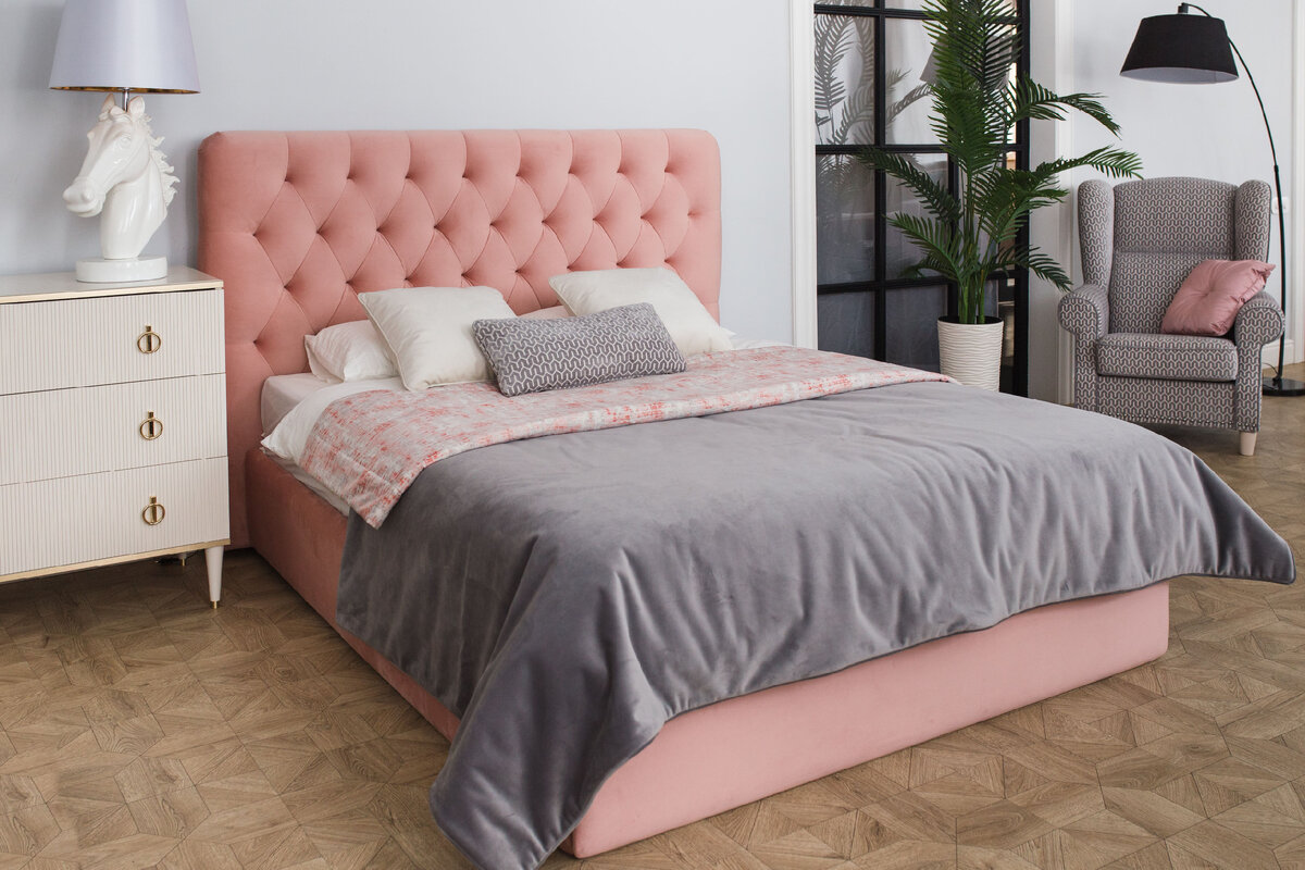 Розовый – частый выбор для спальни. Поэтому без розовой кровати не обошлось. У этой модели оригинальные чуть вздернутые «ушки» изголовья и разлетный ряд утяжек с пуговицами на обивке. Прохладный розовый оттенок будет хорошо сочетаться с белыми, бежевыми и другими пастельными тонами, которые часто фигурируют в спальнях.