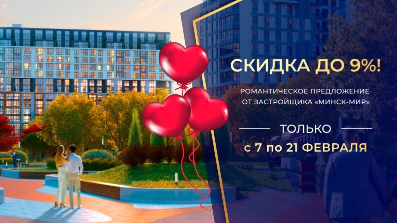 Только с 7 по 21 февраля Вам предоставляется уникальная возможность: воспользоваться скидкой до 9% практически на все объекты недвижимости комплекса, а именно на квартиры, многофункциональные помещения и помещения административно-торгового назначения. Скидкой могут воспользоваться семейные пары (супруг/супруга) - это могут быть как молодожёны, так и те, кто состоит в браке (чтобы получить скидку нужно предъявить свидетельство о браке). В комплексе создается вся необходимая для комфортного проживания инфраструктура. Развитая инфраструктура общественного транспорта. Рядом с комплексом уже функционирует станция метро «Ковальская Слобода». В этом году планируется запуск станции метро «Аэродромная», продолжающей Зеленолужскую линию Минского метрополитена. Постепенно дополняются маршруты общественного наземного транспорта. Современные детские сады и школы. В них есть все необходимое для комфортного процесса получения знаний воспитанниками. Спортивные объекты: спортивные площадки, теннисные к