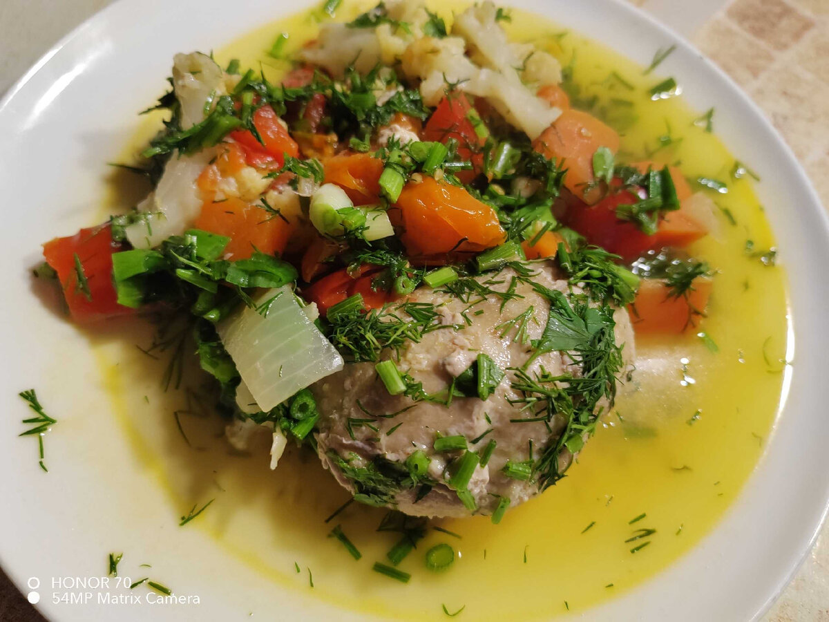 Котлеты были из «заготовки», замороженные. Но можно и свежеприготовленные. Фарш: говядина, куриная грудка без кожи, творог, соль, перец, чеснок. Все по вкусу, у меня - 200 г говядины, 400 г кургрудки, 200 г 5% творога, большая луковица, зубчик чеснока, соль, перец. Перебиваем в блендере/мясорубке. Формируем котлетки мокрыми руками. Овощи: лук, морковь (убрать, кто не ест), перец болгарский, цветная капуста, помидорки черри. На сковороду выкладываем овощи, столовую ложку масла растительного, чуть подсолить и 100 мл воды. Доводим до кипения под крышкой. Как закипит сверху выкладываем замороженные котлеты, и тушим до готовности котлет на медленном огне под крышкой. Как только овощи дадут сок, утапливаем котлетки в овощи. У меня ушло 20 минут на готовку. Засыпаем зеленью и даем постоять минуты 3 под крышкой. Общая масса ужина из 1 котлеты и порции овощей — около 350 г. КБЖУ ужина — 207/18/10/11. ХЕ — 0,9. + 3 фото От наших друзей: Валентин Смирнитский, актёр, народный артист России, на Рад