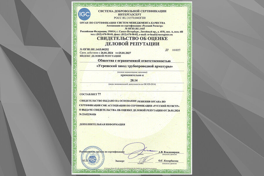 Угрешский завод трубопроводной арматуры продлил на 3 года срок действия свидетельства об оценке деловой репутации в СДС ИНТЕРГАЗСЕРТ.
