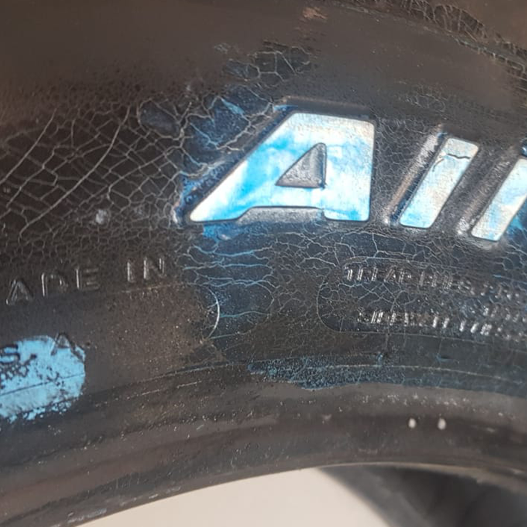 При покупке шин вы можете обратить внимание на то, что буквы вовсе не белые, а скорее синие. Причём чётко можно заметить, то что синяя краска в виде налёта даже имеет растрескивания. Это не брак и не дефект. Синяя краска — это специальный защитный слой, который предотвращает загрязнение белых букв.