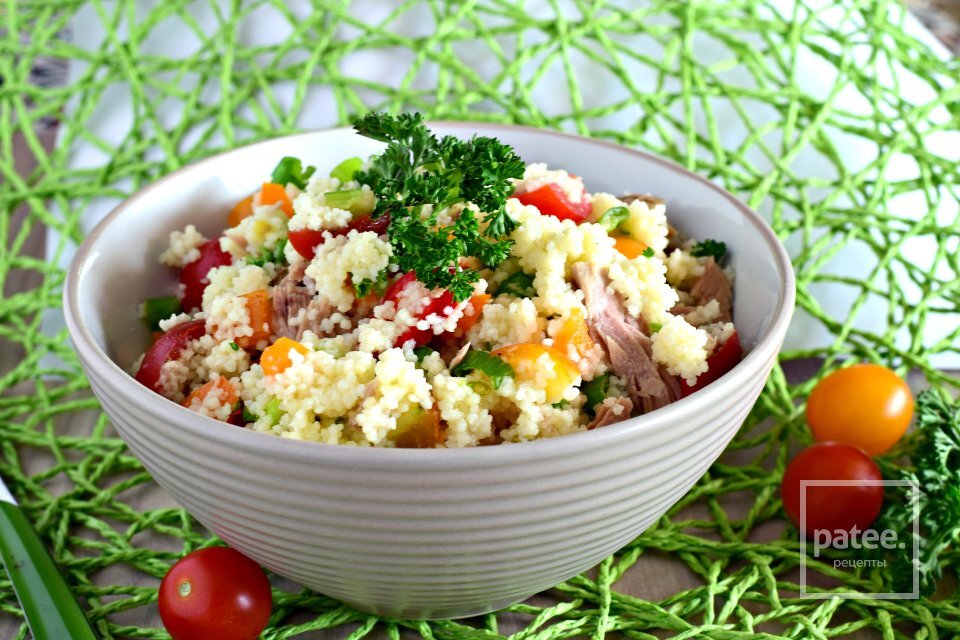 Вот рецепт тунца с кускусом и овощами: ### Ингредиенты: - 2 тунцовых стейка (примерно по 150 г каждый) - 1 чашка кускуса - 1 ½ чашки кипятка - 1 крупный красный перец, нарезанный кубиками - 1 крупная морковь, нарезанная кубиками - 1 крупный кабачок, нарезанный кубиками - 2 стебля зеленого лука, нарезанные - 2 столовые ложки оливкового масла - Соль и перец по вкусу - Свежая зелень для подачи (петрушка, базилик или кинза) ### Инструкции: 1. Подготовьте кускус, залейте его кипятком в большой миске, накройте крышкой и оставьте на 5-7 минут, пока кускус не впитает всю воду. 2. В это время подготовьте овощи. В сковороде на среднем огне разогрейте 1 столовую ложку оливкового масла. Обжаривайте морковь, перец и кабачок до мягкости, примерно 5-7 минут. Посолите и поперчите по вкусу. 3. Вторую столовую ложку оливкового масла нанесите на тунцовые стейки, посолите и поперчите. Обжаривайте стейки на горячей сковороде среднего размера 2-3 минуты с каждой стороны (время зависит от предпочтений по