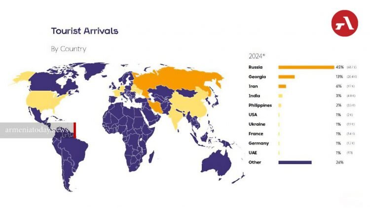 Армению в январе посетили 154 тысячи туристов, что на 5 тысяч человек меньше показателя января 2023 года, сообщила пресс-служба Минэкономики cо ссылкой на данные туристического портала ведомства The Hidden Track. Большинство туристов прибыли в Армению из России (45%). Второе место по количеству прибывших занимают туристы из Грузии (13%). В пятерку стран с большим турпотоком попали также Иран (6%), Индия (3%) и Филиппины (2%). Согласно данным, около 33% прибывших – люди 35-44 лет. В декабре 2023 года Минэкономики назвало Armenia Today топ-5 стран с самым большим турпотоком в Армению за период с 2018 по 2023 год. В этот список вошли Россия, Грузия, Иран, США и Германия. По данным министерства, турпоток из России в Армению в 2023 году увеличился вдвое, составив 1 036 365 туристов в сравнении с 531 466 в 2018 году.