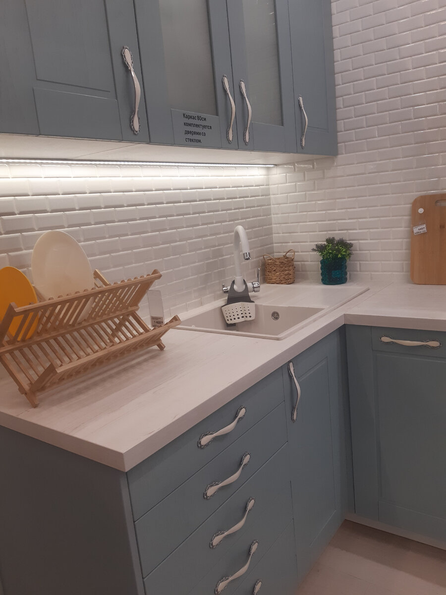 Следующие несколько статей будут посвящены кухне из Леруа Мерлен, которую мы решили установить у себя в доме. Почему именно Мерлен - все просто, Икея к этому моменту закрылась, выносить оставшиеся склады не хотелось, а Мерлен под боком:). Отмечу, кухня Мерлен выходила дешевле тысяч на 30, а то и 40. Забегая вперед и, сравнивая с кухнями Икея, - Мерленовская кухня уступает по качеству (мы не берем самые дешевые варианты, у нас средний ценовой сегмент кухонь). По цвету я хотела кухню или светло-серую, или голубую, как вариант бирюзовую. Выбор пал вот на эту кухню: Мы заменили ручки, столешницу и фартук, раковину и кран:). Поскольку кухни универсальные, то внутри у них сделано много маленьких отверстий, которые, скорее всего, кого-то подбешивают. Предварительно я сама сделала план кухни на сайте Мерлен и с ним уже пошла в магазин на корректировку, что сэкономило мне время. Далее мы с сотрудником магазина доработали план, добавили/убрали детали, оплатили и ждали доставки. От сборки мы от