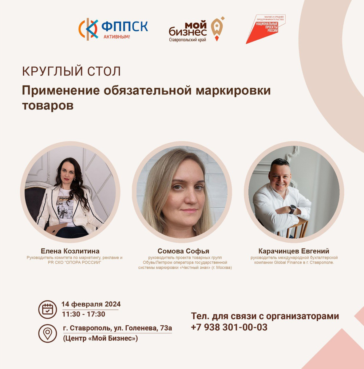 Специально для предпринимателей Ставропольского края центром «Мой бизнес», функционирующим на базе некоммерческой организации «Фонд поддержки предпринимательства в Ставропольском крае», 14 февраля с 11:30 до 17:30 будет проводиться круглый стол «ПРИМЕНЕНИЕ ОБЯЗАТЕЛЬНОЙ МАРКИРОВКИ ТОВАРОВ» 📈 КАКИЕ ТЕМЫ ОБСУДИМ НА КРУГЛОМ СТОЛЕ: