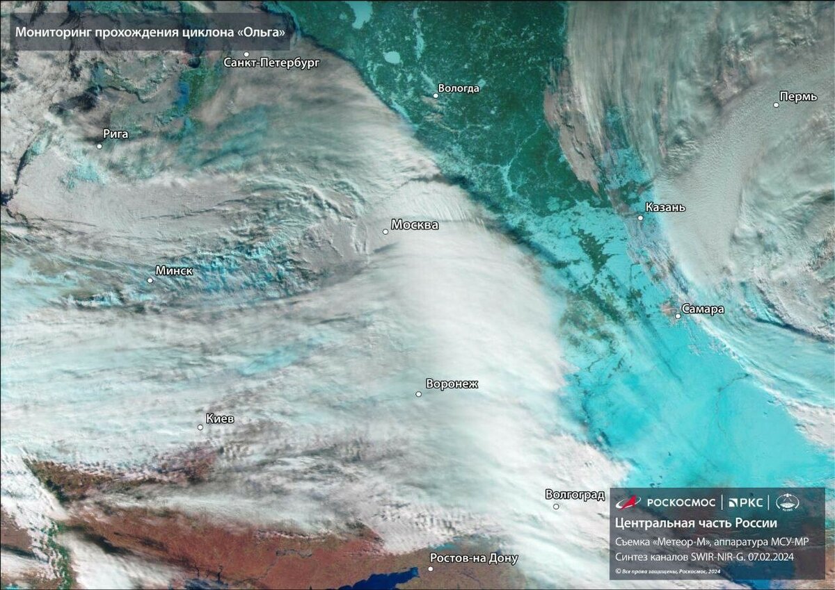 Фото: t.me/roscosmos_gk/ «На спутниковом снимке „Метеора-М“ — циклон „Ольга“. Он образовался на юге Гренландии и движется в сторону Поволжья», — отмечает пресс-служба Роскосмоса. На момент, когда был сделан снимок, снеговые облака еще не достигли территории Татарстана, хотя уже добрался до Москвы, Воронежа и Волгограда. К выходным в столице страны должно выпасть до четверти месячной нормы осадков. На трассе М4 «Дон» в подмосковном городе Ступино во время снегопада столкнулись 29 автомобилей — в результате один человек погиб и еще семь пострадали.