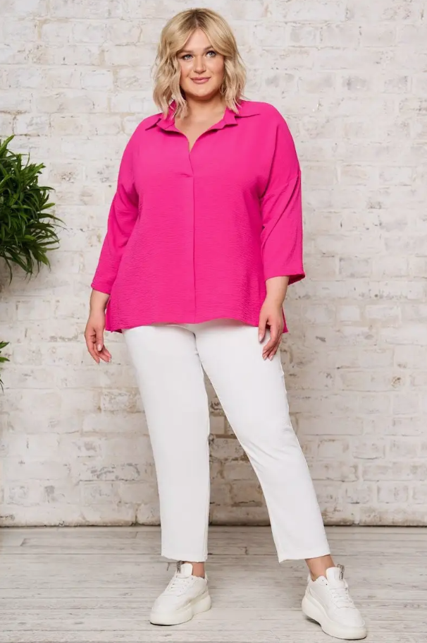 Женщинам в теле стоит выбирать рубашки прямого силуэта, свободные, но не слишком объёмные. А что касается цвета, то совсем необязательно носить исключительно темное. Примерьте белую рубашку, и убедитесь, что в светлой одежде вы выглядите свежее и моложе.