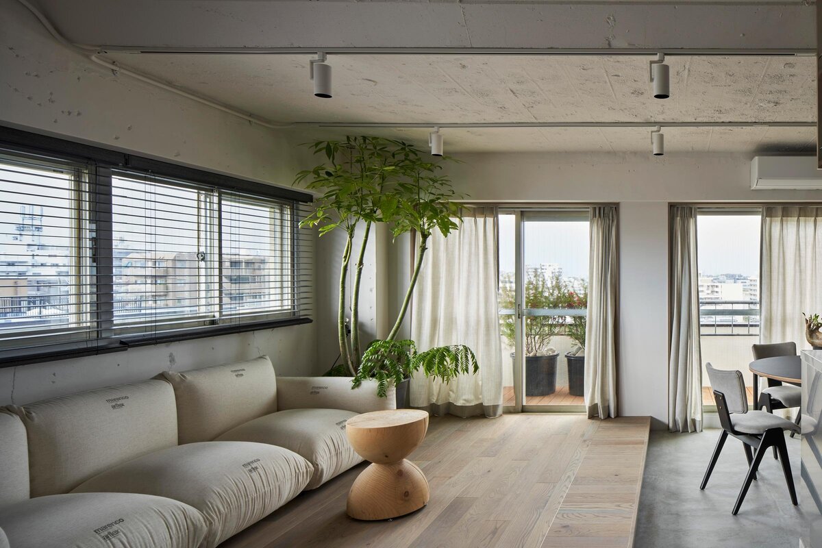 Этот 50-летний дом в Токио был отремонтирован местной студией Moss, чтобы стать ярким и функциональным пространством, предназначенным для современной жизни. По желанию клиентов планировка с двумя спальнями площадью 60 квадратных метров была превращена в квартиру с одной спальней, большой гостиной, столовой и кухней. Каждая функция была интегрирована посредством минимального подхода к цветам, что также соответствовало запросу клиента. В гостиной длинные горизонтальные окна — редкая особенность современных токийских домов — обеспечивают достаточное количество естественного света и делают комнату более просторной. Концепция гостиной заключалась в том, чтобы создать атмосферу открытой террасы внутри столичной токийской квартиры. Длинный коридор ведет в центр квартиры, добавляя глубины и создавая ощущение предвкушения. Одна комната объединяет спальню, кабинет и кладовую, что позволяет эффективно использовать площа