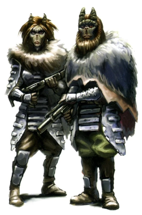 Готалы - представители высокого двуногого вида, обитающие на Антаре-4, луне, вращающейся вокруг газового гиганта Антар в системе Приндар. Этот мир богат полезными ископаемыми, а более 60 процентов планеты покрыто водой с сильными приливными колебаниями. Цикл ночи и дня на Антаре непостоянен из-за отражающей природы планеты. Временами вся Луна залита светом, а в другие периоды погружается во тьму. Из-за этого местные обитатели во многом полагаются на другие органы чувств, кроме зрения. Серо-коричневая грубая кожа защищает их лица от экстремальных температур, а глаза с красным оттенком позволяют им видеть фигуры в кромешной тьме. Плоские носы выступают над мордой всего на сантиметр или около того, а острые резцы служат для пережевывания мяса дичи. Лохматый серый мех покрывает их тело. Два конусообразных рога на голове компенсируют недостаток слуха и зрения у готалов. Рожки готала способны улавливать изменения магнитных полей, инфракрасные излучения, энергетические волны, нейтринную бом