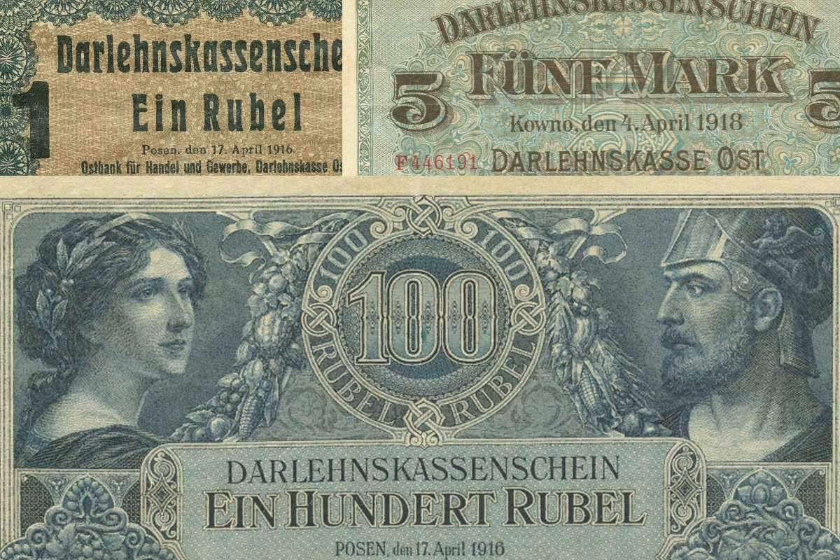 Ссудная касса "Восток" была основана в 1916 году как эмиссионный банк для территории Верховного главного командования всеми германскими вооружёнными силами на Востоке (включала территории тогдашней Российской империи, оккупированные немецкой армией во время Первой мировой войны, общая площадь которых составляла около 108 800 км2). В 1916 году она выпустила банкноты с датой 17.4.1916 в Восточном банке торговли и промышленности в Позене (ныне Познань), номинированные в копейках и рублях (20 и 50 копеек, а также 1, 3, 10, 25 и 100 рублей). В 1918 году последовали марки ссудной кассы "Восток" в городе Ковно (ныне Каунас) с датой от 4.4.1918 года более ½, 1, 2, 5, 20, 50, 100 и 1000 марок. Банкноты, выпускаемые фирмой Giesecke & Devrient и имперской типографией, также некоторое время продолжали продаваться в странах Балтии — Эстонии, Латвии и Литве, которые стали независимыми после войны. Банкноты назывались "оберостгельды" или "восточные рубли" и "восточные марки" соответственно. Соотношен