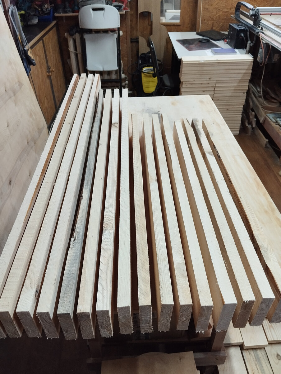 Данный стол будет использоваться как для распиловочного станка, так и как сборочный. Размер стола будет 1520*1200 мм. Весь каркас стола буду делать из доски 25*100 мм. Для начала напиливаю все детали в размер. Все заготовки прогнал через рейсмус. Собираю ножки, это будут две доски, скрученные между собой вот таким образом: Дальше собираю каркас самого стола На боковые стенки креплю две стойки, для того чтобы к ним прикрутить перемычку. На эти перемычки стелю фанеру 15 мм, это будет место для самой пилы: На задние ножки стола прикрутил колёса, а перед оставил без колёс, возможно потом добавлю ещё два колеса, посмотрю как будет удобно. Нижнюю полку стола зашиваю фанерой 12 мм В качестве столешницы использую фанеру 15 мм Отпиливаю лишний кусок фанеры, там где будет станок Стол готов. Саму пилу закрепил на обычные болты с гайкой.