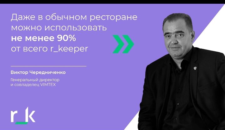Накануне VI Всероссийского конгресса рестораторов ТОП-100 https://top100premium.restoved.ru мы взяли интервью у Виктора Чередниченко, генерального директора и совладельца VIMTEX – одного из дилеров r_keeper – и узнали о формате предстоящего мероприятия и важности участия в нем. Какая роль VIMTEX на конгрессе рестораторов? Роль — донести до наших и потенциальных клиентов современные решения и новые возможности. Рассказать о том, в каком направлении движутся не только компания VIMTEX и бренд r_keeper, но и весь бизнес HoReCa. Помимо нашей экспозиции, которая будет сопровождать конгресс все три дня, всем будет полезен foodtech-форум «Технологии настоящего со взглядом в будущее» на второй день. Каждый сможет получить максимум пользы от участия. Что планируете демонстрировать на мероприятии? В первую очередь, программные решения, их функционал и обновления, о которых мало кто знает. Например, для работы с маркировкой товара. Среди продуктов будут все модули r_keeper от StoreHouse до «Мобил