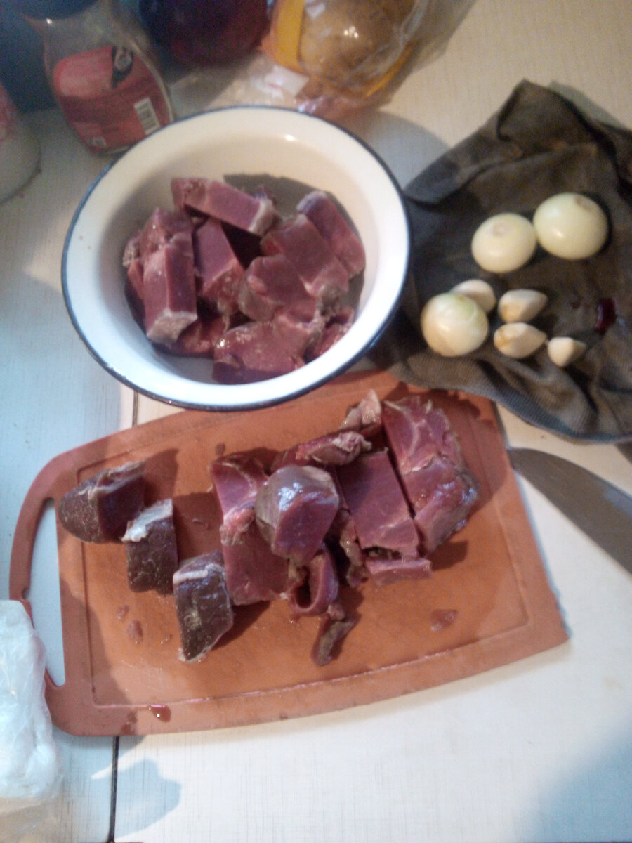 Дано: кусок лосятины. Откуда взял не спрашивайте, все равно не скажу. Конечно можно и потушить, но хочу котлет! 🍔 На вид вес лося грамм шестьсот. Смотрите и учитесь как надо готовить. Режем на куски и в мясорубку. Электро конечно. Тяжело мужику ручку крутить. Что там еще? Лук. На вскидку парочку, можно побольше. Кашу луком не испортишь. Чеснок. Побольше! Полголовки. Нет побольше. У меня же озимый. А его можно и так без мяса есть. Совсем не острый. Все это туда же в мясорубку. Кусок нутряного свиного жира - побольше, тоже в мясорубку. Все провернуть. В конце засунуть в мясорубку пару сухарей, можно побольше, чтоб протолкнуть живительную смесь из мясорубки в миску. Так яйца. Яиц нет! 😂😂😂 Бывает же такое! Дальше не буду. Пошлятина пойдет. Перец красный - побольше, черный - побольше. Приправа из сушеного укропа, базилика и лаврушки - побольше. По пол чайной ложки каждого. Еще б таблеточек от жадности - побольше. Три куска белого хлеба, можно побольше, замочим в воде и в фарш. Соль.