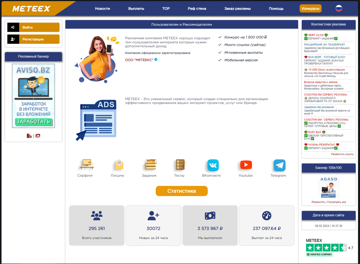 Meteex это новый сайт-букс для заработка в интернете, который активно развивается. В отличие от других буксов, здесь продвинутая система рейтинга, его можно покупать или продавать на бирже, и получать пассивный доход. Чем больше у вас рейтинга тем больше вы будете получать, вообще ничего не делая. Примеры сёрфинга и просмотра ютуба. Заданий не так много, они малооплачиваемые и зачастую, это зарегистрироваться по чьей-то реф ссылке. Рейтинг За каждое действие дают рейтинг, он не только повышает ваш уровень, но и увеличивает пассивный заработок. Как говорится на самом сайте в новостях "То-есть чем больше вы будете работать, тем больше вы будете получать процент дохода от нашей рекламной компании (КУСОК ПИРОГА)" и основной доход потом, вы будете получать отсюда. Плюс курс рейтинга постоянно растёт и актив сайта увеличивается Выводы на кошельки Уникальность этого проекта состоит ещё и в том, что вы можете выводить любые суммы, в любом