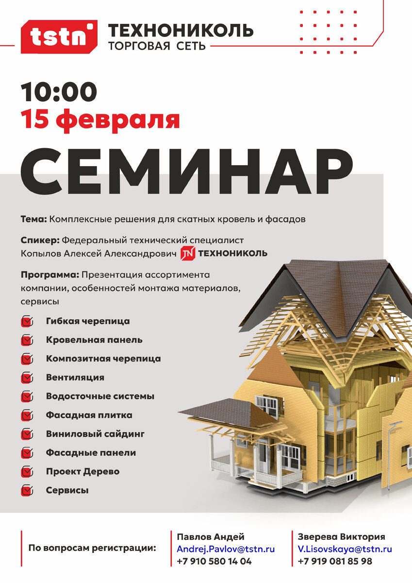 Приглашаем всех заинтересованных принять участие в семинаре от Торговой Сети ТЕХНОНИКОЛЬ. В программе: презентация ассортимента компании, особенности монтажа материалов и сервисы для тех, кто строит. Спикер мероприятия: Федеральный технический специалист ТЕХНОНИКОЛЬ Копылов Алексей Александрович. Поговорим о таких материалах и тонкостях монтажа, как: Дата проведения: 15 февраля 2024 г, начало в 10:00, продолжительность 3 часа. Ждем вас на семинар. Будет качественная информация от настоящих профессионалов. По вопросам регистрации и мест обращайтесь: