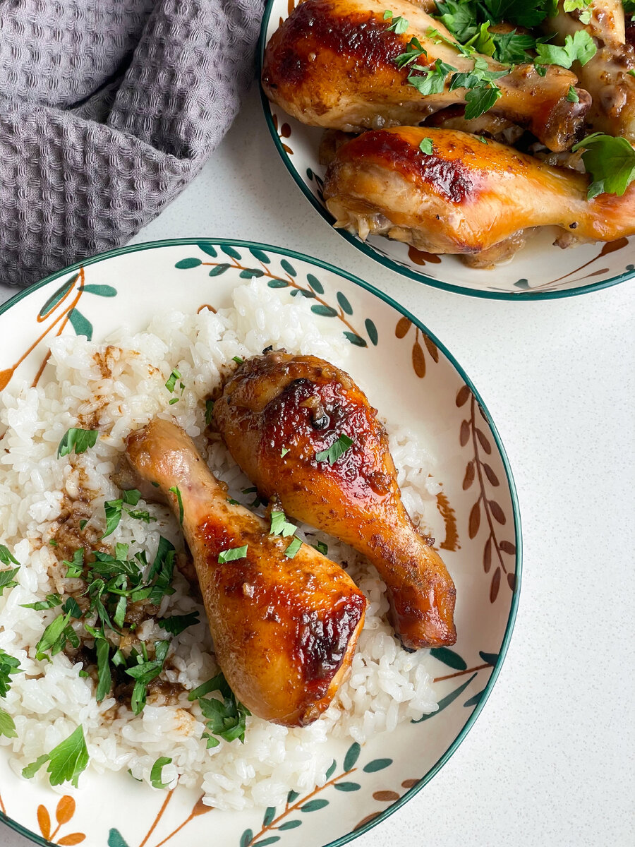 Если любите сладковатые, пряные маринады, такая курочка вам точно понравится! Ингредиенты: Куриные голени - 800 г Соевый соус - 100 мл Мед - 2 ст.л. Уксус винный - 2 ст.л. Чеснок - 2 зубчика Имбирь молотый - 1 ч.л. Перец молотый Смешать соевый соус, мед, уксус, измельчённый чеснок, перец и имбирь до однородности. Куриные ножки выложить в маринад, хорошо перемешать и оставить при комнатной температуре на час. Если мариновать будете дольше, то убрать в холодильник. Вылить маринад в сотейник, а ножки выложить в форму или на противень, застеленный пергаментом и выпекать при 180 градусах 40-50 минут, до румяного цвета. В сотейник к маринаду добавить 50 мл воды, довести до кипения, убавить огонь и варить до загустения. Этим соусом полить готовую курицу при подаче! Приятного аппетита! И приятного просмотра видео ❤️