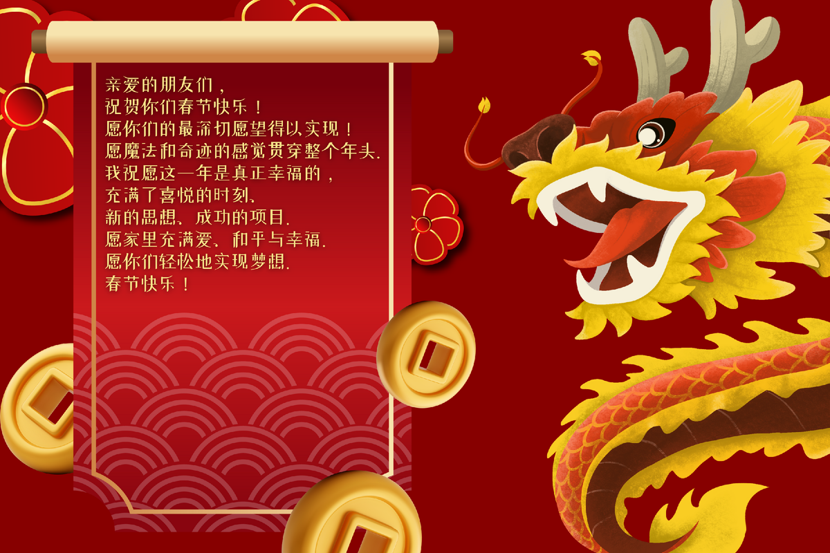 尊敬的中国合作伙伴!在过去的一年里,我们通力合作,解决问题,实现目标,并为胜利而欢呼。非常感谢你们的可靠性和专业能力。祝贺你们龙年快乐!祝你们在新的一年里取得成功,开辟新的领域和成就。愿新的一年对你们而言充满成功,充满幸运!让我们的友谊更加牢固!
