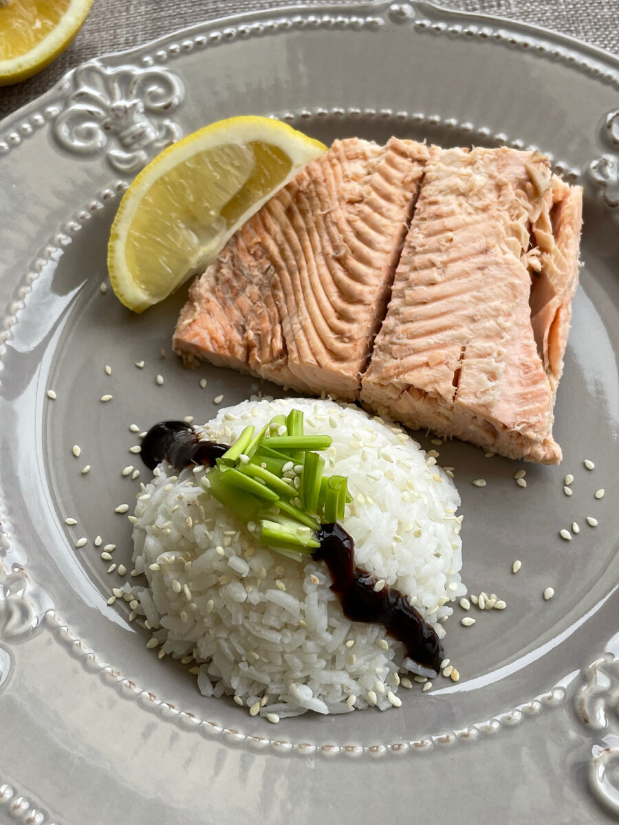 ЗАПЕЧЕННАЯ ГОРБУША С РИСОМ 🐟Горбуша тушка 1 шт около 1,5 кг 🍋Лимон 0,5 шт. 🌿Розмарин 1 ветка 🧅Луковица 1 шт. 🧂Соль и перец по вкусу 🍚Рис длиннозерный 1 стакан 🧊Вода 1.5 стакана 🍶Соевый соус 🌿Зеленый лук и семена кунжута по желанию. У меня была горбуша на 1.5 кг., потрошенная с головой. Голову и значительную часть хвоста отрезала, остался кусок на 1.1 кг. Примерно на 4 порции. Способ изготовления: 1. Рыбу натираем солью и перцем,сбрызгиваем маслом ,внутрь кладем веточку розмарина и дольку лимона (можно выдавить немного сока прям в середину рыбы) 2. В форму для запекания выкладываем нарезанный кольцами лук и на него кладем нашу рыбу. 3. Духовку на 220 гр. полностью прогреваем. Ставим форму с рыбой ровно на 10 минут,выключаем духовку и оставляем там рыбу ещё на 15 минут. Рыба готова. 4. Отвариваем рис, в соотношении с водой 1:1,5. Без соли. Готовый рис заправляем соевым соусом и посыпаем кунжутом и зеленым луком. Горбуша получается нежная ,сочная и ароматная.