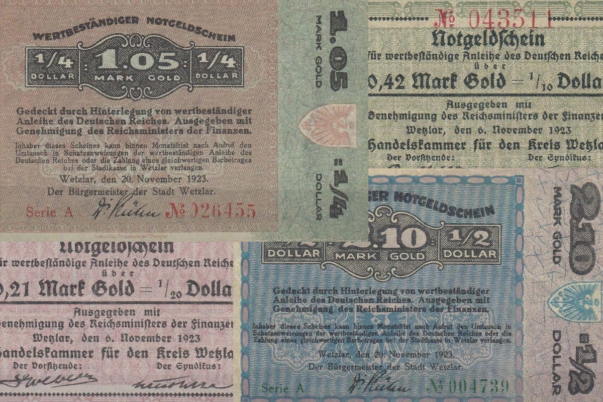 С 23 октября 1923 года правительство Рейха разрешило предприятиям и муниципалитетам выпускать ценные чрезвычайные деньги, если они были номинированы в частях золотых облигаций Рейха от 14 августа 1923 года и обеспечивались этими облигациями. Чрезвычайные деньги должны были номинально выражаться в 4,20 золотых марок или меньше. Рядом с надписью "Notgeldschein" на купюрах должна была быть пометка "Выпущено с разрешения рейхсминистра финансов". Более высокие номиналы золотых облигаций Рейха впоследствии были в значительной степени депонированы торговыми палатами и городами в Рейхсбанк и, таким образом, использовались для покрытия их собственных постоянных срочных денежных расходов, в том числе в городе Вецлар. В городе Вецлар, входящем в состав Рейнской области, но находящемся в Гессенской языковой и экономической зоне, в конце 1923 года было произведено четыре различных выпуска устойчивых к потерям денежных средств. Однако из них только выпуск Торговой палаты для района Вецлар приобрело