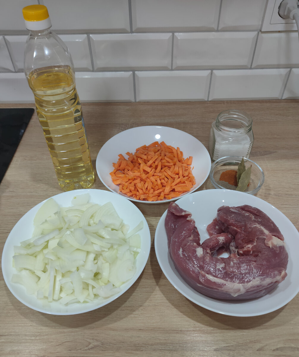 Нам понадобится: Приступим к готовке. Первым делом нужно помыть, очистить овощи. Лук нарезать полукольцами, морковь соломкой. Помыть, обсушить мясо и удалить с него сухожилия. Мясо нарезаю небольшими кусочками. Далее в казан наливаю масло, нужно хорошо его разогреть. В раскалённое масло отправляю лук. Жарю на сильном огне 2-3 минуты, постоянно помешивая. Через пару минут добавляю морковь. Лук вместе с морковью жарю ещё 5 минут. Пришло время добавлять мясо. Также жарю на сильном огне, постоянно помешивая. Буквально 5-7 минут. Чтобы мясо немного подрумянилось. Теперь убавляю огонь на минимум, (чтобы оно томилось), вливаю воду , всё хорошо перемешиваю и оставляю рушиться под крышкой на 40 минут. Иногда перемешиваю, Раза 2-3 за это время. За 10 минут до готовности добавляю специи и лавровый лист. Пробую мясо. У меня было молодое и нежное, было уже готово. Можно накрывать на стол и звать семью на ужин. У меня на гарнир гречка. Мясо получилось очень нежное и ароматное, как говорится,